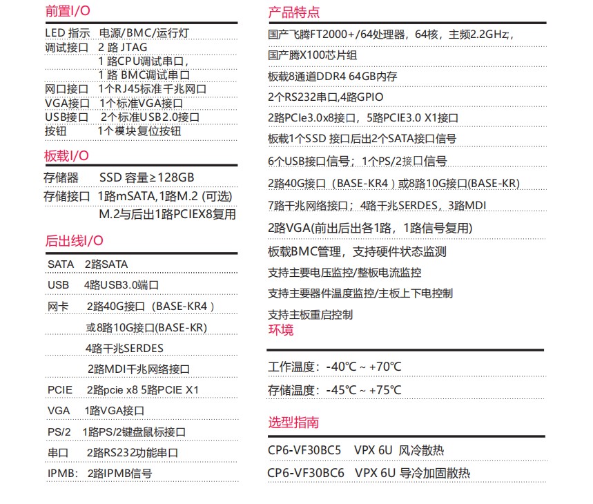 模塊基于飛騰FT2000+/64處理器,選用飛騰自 研X100橋片。模塊支持100%國產化設計。符合 Vita65規范,6U VPX規格。具備豐富的外圍接口; 設計了高效的散熱系統,可顯著提高處理器的浮點運 算性能,以太網、PCIe、支持帶寬數據傳輸,是一款 滿足視頻采集與處理、雷達和聲吶等應用對高速數據 傳輸的要求。滿足無人機、裝甲車、水面艦艇等軍工領域。